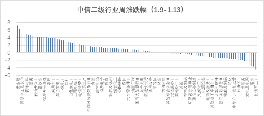 根据中信二级行业分类,涨幅靠前的行业有贵金属、产业互联网、照明电工及其他、厨房材料Ⅱ、装饰材料,分别上涨7.20%、6.19%、5.09%、5.03%、4.89%;跌幅靠前的行业有其他军工Ⅱ、航空航天、渔业、互联网媒体、发电及电网,分别下跌4.43%、3.69%、3.60%、3.14%、2.37%。