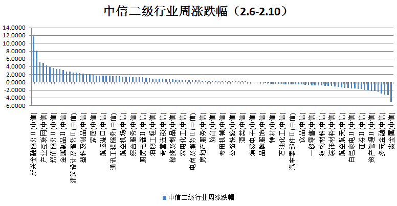 本周上证指数跌0.08%,创业板指数跌1.35%,沪深300指数跌0.85%,中证500指数跌0.15%。根据中信二级行业分类,本周涨幅靠前的行业新兴金融服务、酒店餐饮、照明电工、产业互联网及通信设备,上涨幅度分别为11.82%、8.05%、5.23%、4.97%、4.31%;本周跌幅靠前的行业是贵金属、乘用车、电信运营、多元金融及稀有金属,下跌幅度分别为5.14%、3.43%、3.27%、2.94%、2.62%。