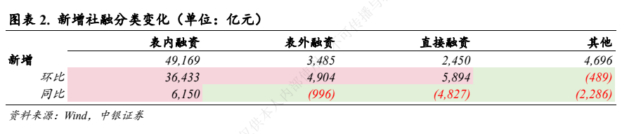 1月社融高于预期,信贷开门红效应显著。1 月社融各分项中,表内融资同比多增 6150 亿元,表外融资同比少增 996 亿元,直接融资同比少增 4827 亿元。1 月表内人民币贷款新增 4.93 万亿元,同比多增 7312 亿元,高于季节性水平,一方面受信贷开门红效应影响,另一方面前期政策性开发性金融工具配套融资、保交楼贷款、设备更新改造贷款加快投放,人民币贷款水平超出预期。表外融资新增 3485 亿元,受地产融资政策改善影响,表外融资回暖。直接融资中企业债融资大幅下滑,同比少增 4352 亿元,形成本月主要拖累,前期债券发行取消潮影响还未完全消除,1 月信用利差仍然偏高,贷款置换债券现象或仍然存在,但随着 2 月以来信用利差加速收窄,企业债融资或逐渐回暖。政府债券融资同比少增 1886 亿元,主要受到春节假期错位以及高基数影响。