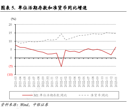 M2同比增速再度回升。1月 M2同比增长 12.6%,较上月上升 0.8 个百分点;M1 同比增长 6.7%,较上月下降 3.0 个百分点;M0 同比增长 7.9%,较上月下降 7.4 个百分点。1 月单位活期存款同比增长 6.49%,较上月上升 4.63 个百分点,准货币同比增长 14.62%,较上月下降 0.20 个百分点。1 月M2 同比增速再度回升,一方面在春节效应下,居民存款季节性大幅增加,另一方面超预期信贷开门红效应下,贷款派生存款同样呈现高增。