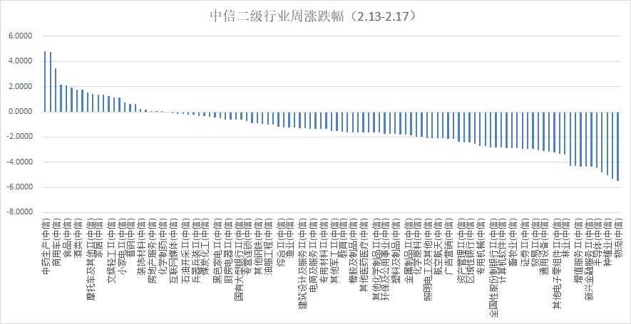 行业方面,根据中信二级行业分类,本周涨幅靠前的板块是中药、工程机械、商用车、电信运营及食品板块,上涨幅度分别为4.79%、4.74%、3.43%、2.16%及2.12%;本周跌幅靠前的板块是物流、互联网、种植业、新能源动力系统及半导体板块,下跌幅度分别为-5.50%、-5.34%、-5.02%、-4.82%及-4.48%。