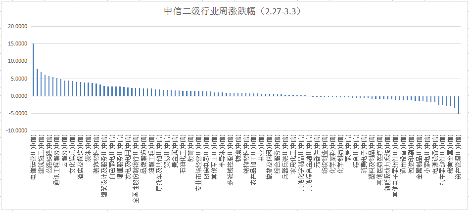 本周各主要指多数上涨,具体表现为:沪深300指数上涨1.71%,上证指数上涨1.87%,中证500指数上涨0.78%,创业板指数下跌0.27%。行业方面,根据中信二级行业分类,本周涨幅靠前的行业有电信运营、互联网媒体、建筑施工、运输设备,分别上涨15.05%、7.85%、6.84%、6.12%;跌幅靠前的行业有资产管理、新兴金融、稀有金属、其他轻工,分别下跌5.18%、3.56%、2.88%、2.82%。