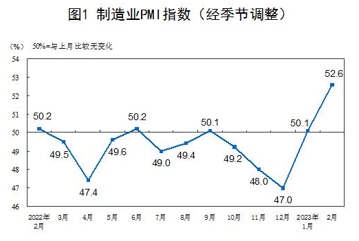1)2月份制造业采购经理指数(PMI)为52.6%,比上月上升2.5个百分点,高于临界点,制造业景气水平继续上升。