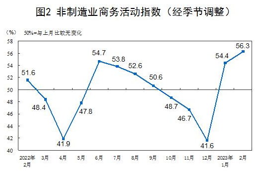2)2月份非制造业商务活动指数为56.3%,比上月上升1.9个百分点,高于临界点,非制造业恢复发展态势向好。