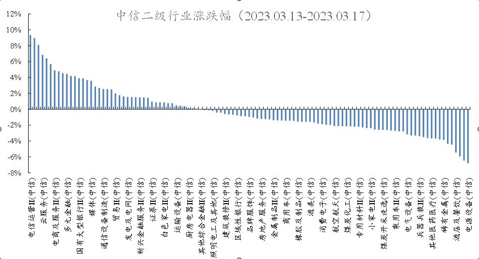 行业方面,根据中信二级行业分类,涨幅靠前的行业有电信运营、产业互联网、广告营销、云服务、建筑施工,分别上涨9.37%、8.96%、8.10%、6.84%、6.42%;电源设备、新能源动力系统、综合服务、酒店及餐饮、汽车销售及服务,分别下跌6.81%、6.47%、5.93%、5.45%、4.45%。