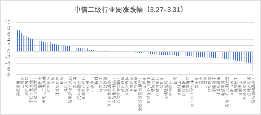 根据中信二级行业分类,涨幅靠前的行业有黑色家电Ⅱ、商用车、云服务、产业互联网、酒店及餐饮,分别上涨7.42%、7.22%、6.28%、5.42%、5.33%;跌幅靠前的行业有新兴金融服务Ⅱ、资产管理Ⅱ、房地产服务、家居、电商及服务Ⅱ,分别下跌6.33%、4.04%、3.86%、3.86%、3.64%。