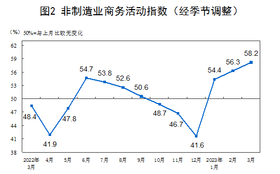 3月份,非制造业商务活动指数为58.2%,比上月上升1.9个百分点,高于临界点,非制造业恢复发展步伐加快。分行业看,建筑业商务活动指数为65.6%,比上月上升5.4个百分点。服务业商务活动指数为56.9%,比上月上升1.3个百分点。从行业看,零售、铁路运输、道路运输、航空运输、互联网软件及信息技术服务、货币金融服务、租赁及商务服务等行业商务活动指数位于60.0%以上高位景气区间;批发、水上运输等行业商务活动指数低于临界点。