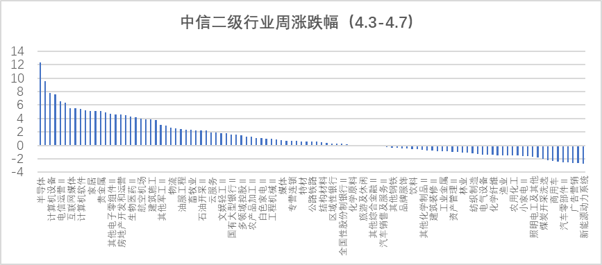 根据中信二级行业分类,涨幅靠前的行业有半导体、通信设备制造、计算机设备、文化娱乐、电信运营Ⅱ,分别上涨12.32%、9.56%、7.83%、7.56%、6.60%;跌幅靠前的行业有新能源动力系统、电商及服务Ⅱ、广告营销、乘用车Ⅱ、汽车零部件Ⅱ,分别下跌2.71%、2.66%、2.58%、2.51%、2.49%。