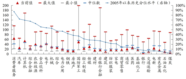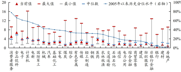 PB分位数前三行业分别为:消费者服务、食品饮料和电子;PB分数位后三行业分别为:房地产、建材和银行。