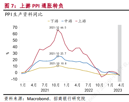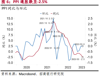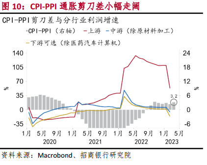 3 月 CPI-PPI 通胀剪刀差走阔至 3.2pct,PPI 通胀在基数影响下下跌较快。预计二季度 CPI-PPI 通胀剪刀差基本走平,下游利润持续改善。 前瞻地看,2023 年上半年 CPI 通胀或将持续低于 1.0%,核心 CPI环比动能中枢则将逐步超出季节性水平。PPI 通胀大概率于二季度触底,底部约为-3.0%。环比增速则将保持在 0.1%附近。