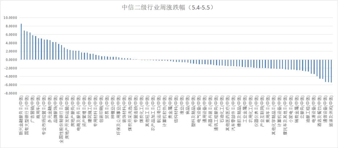 行业方面,根据中信二级行业分类,本周涨幅靠前的板块是新型金融服务、媒体、国有银行、建筑设计及服务与广告营销板块,上涨幅度分别为8.55%、6.94%、6.75%、6.45%及5.85%;本周跌幅靠前的板块是旅游休闲、白色家电、通信设备、元器件及酒店餐饮板块,下跌幅度分别为-5.41%、-5.35%、-5.31%、-4.58%及-4.54%。