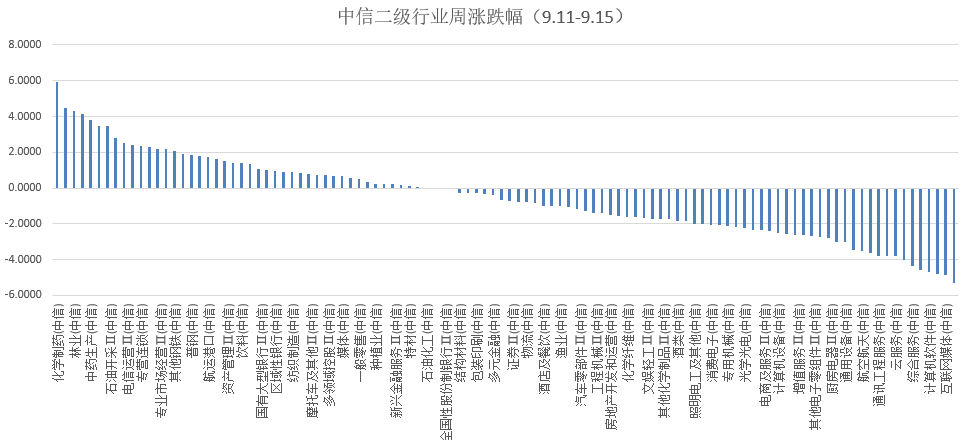 本周上证指数涨0.03%,创业板指数跌2.29%,沪深300指数跌0.83%,中证500指数跌0.07%。根据中信二级行业分类,本周涨幅靠前的行业为化学制药、煤炭开采洗选、林业、生物医药及中药生产,上涨幅度分别为5.94%、4.49%、4.29%、4.13%、3.79%;本周跌幅靠前的行业为产业互联网、互联网媒体、新能源动力系统、计算机软件及装饰材料,下跌幅度分别为5.30%、4.86%、4.82%、4.70%、4.59%。