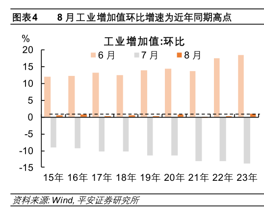 8月需求端改善超预期。季节性调整后,8月社会消费品零售回升,其中商品消费的底部回升是主要支撑,但餐饮消费从高位有所回落;地产销售有所企稳;固定资产投资规模有所回升,制造业、基建投资在8月环比均出现回升,地产投资也有所企稳。生产端也出现一定改善的迹象。季节性调整后,8月工业增加值环比增长0.8%(前值-2.6%),显示工业生产在7月的回落后边际回升。同时,发电量与出口交货值在季节性调整后也有所回升。