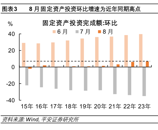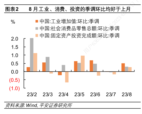 8月需求端改善超预期。季节性调整后,8月社会消费品零售回升,其中商品消费的底部回升是主要支撑,但餐饮消费从高位有所回落;地产销售有所企稳;固定资产投资规模有所回升,制造业、基建投资在8月环比均出现回升,地产投资也有所企稳。生产端也出现一定改善的迹象。季节性调整后,8月工业增加值环比增长0.8%(前值-2.6%),显示工业生产在7月的回落后边际回升。同时,发电量与出口交货值在季节性调整后也有所回升。