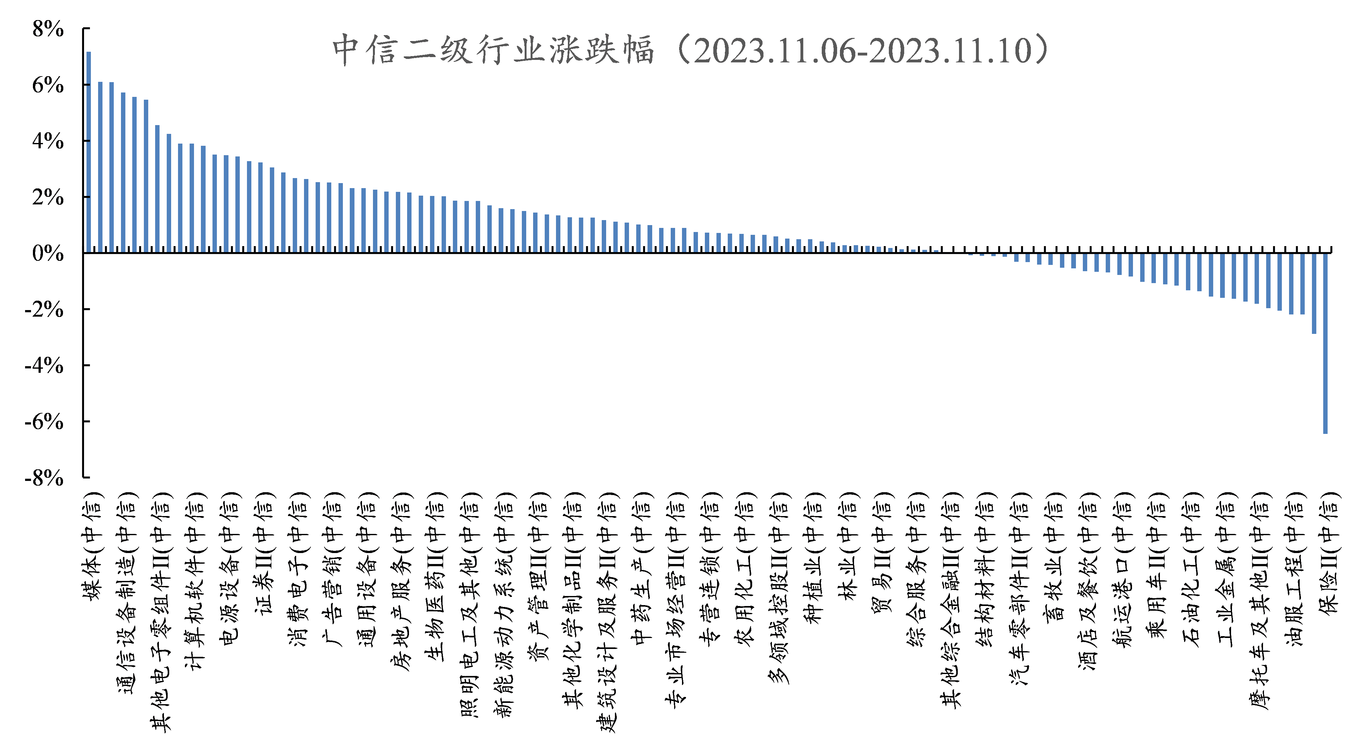 行业方面,根据中信二级行业分类,本周涨幅靠前的行业有媒体、通讯工程服务、云服务、通信设备制造、黑色家电,分别上涨7.17%、6.09%、6.09%、5.71%、5.56%;本周跌幅靠前的行业有保险、贵金属、橡胶及制品、油服工程、酒类,分别下跌6.45%、2.88%、2.19%、2.19%、2.06%。