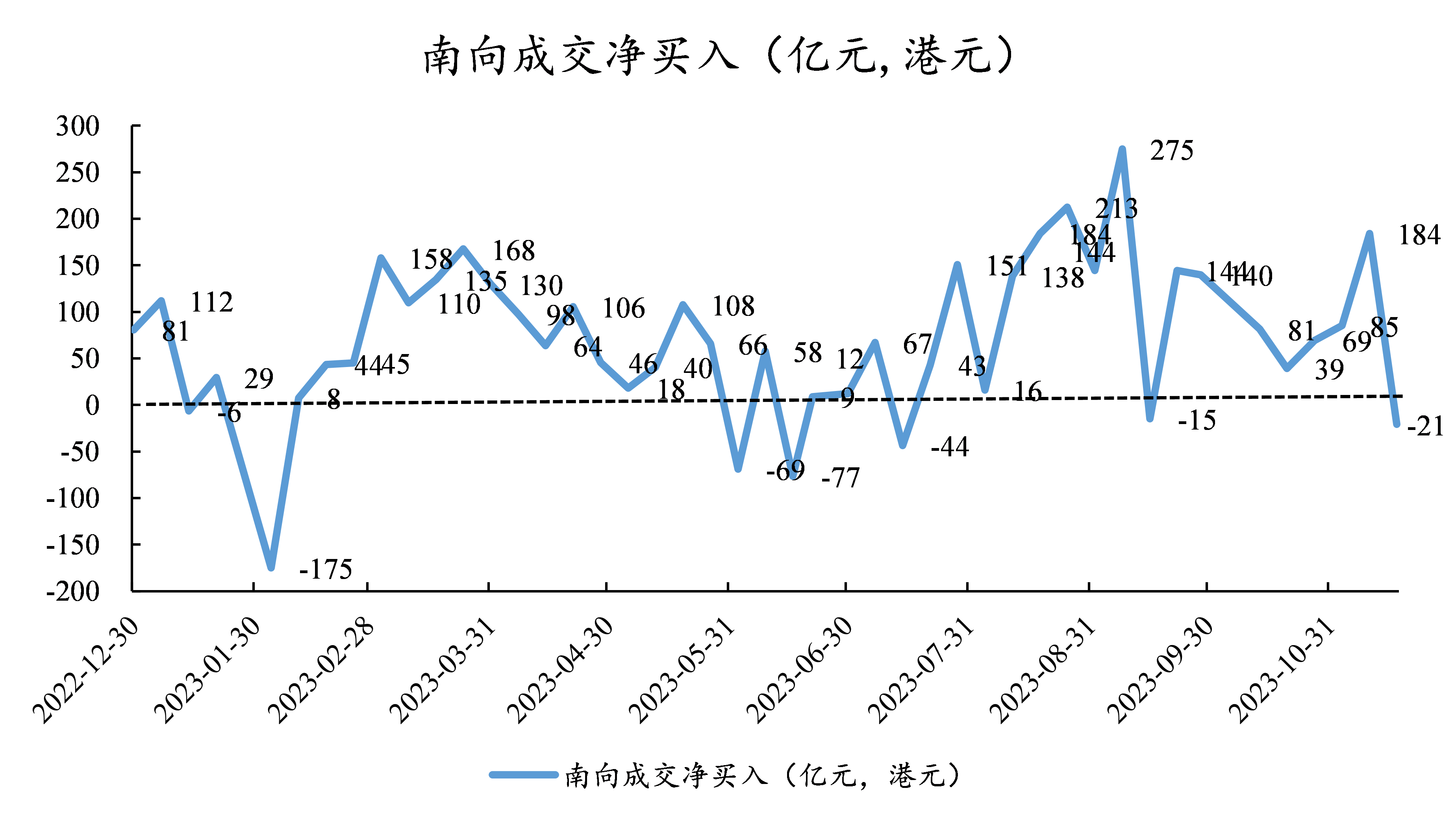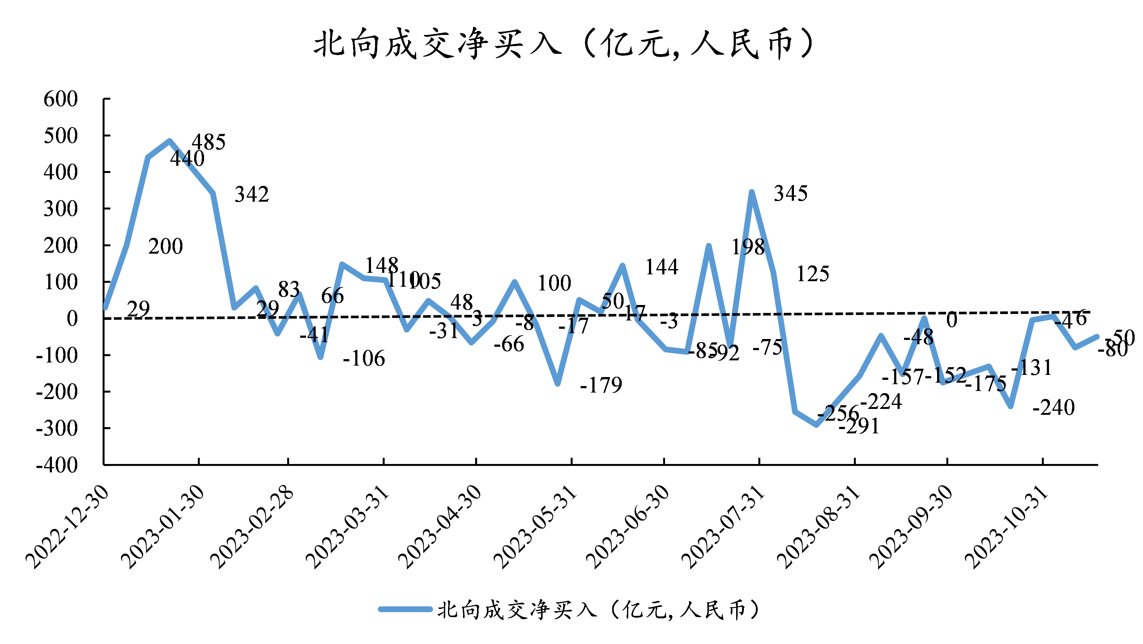本周A股市场大小盘股走势差别明显,上证50、沪深300指数分别下跌0.66%、0.51%,中证1000、中证2000指数分别上涨1.82%、3.19%。本周市场日均成交额在9000亿左右比较活跃,市场风格仍然以主题投资和中小盘股为主,TMT、汽车等板块受近期华为带动继续保持强势,而大消费、金融、地产链等板块走势较弱。北向资金本周净卖出49.8亿元,在经历了连续三个月的大幅净卖出之后,随着美联储利率周期逐步明确,11月外资流出有所放缓。
