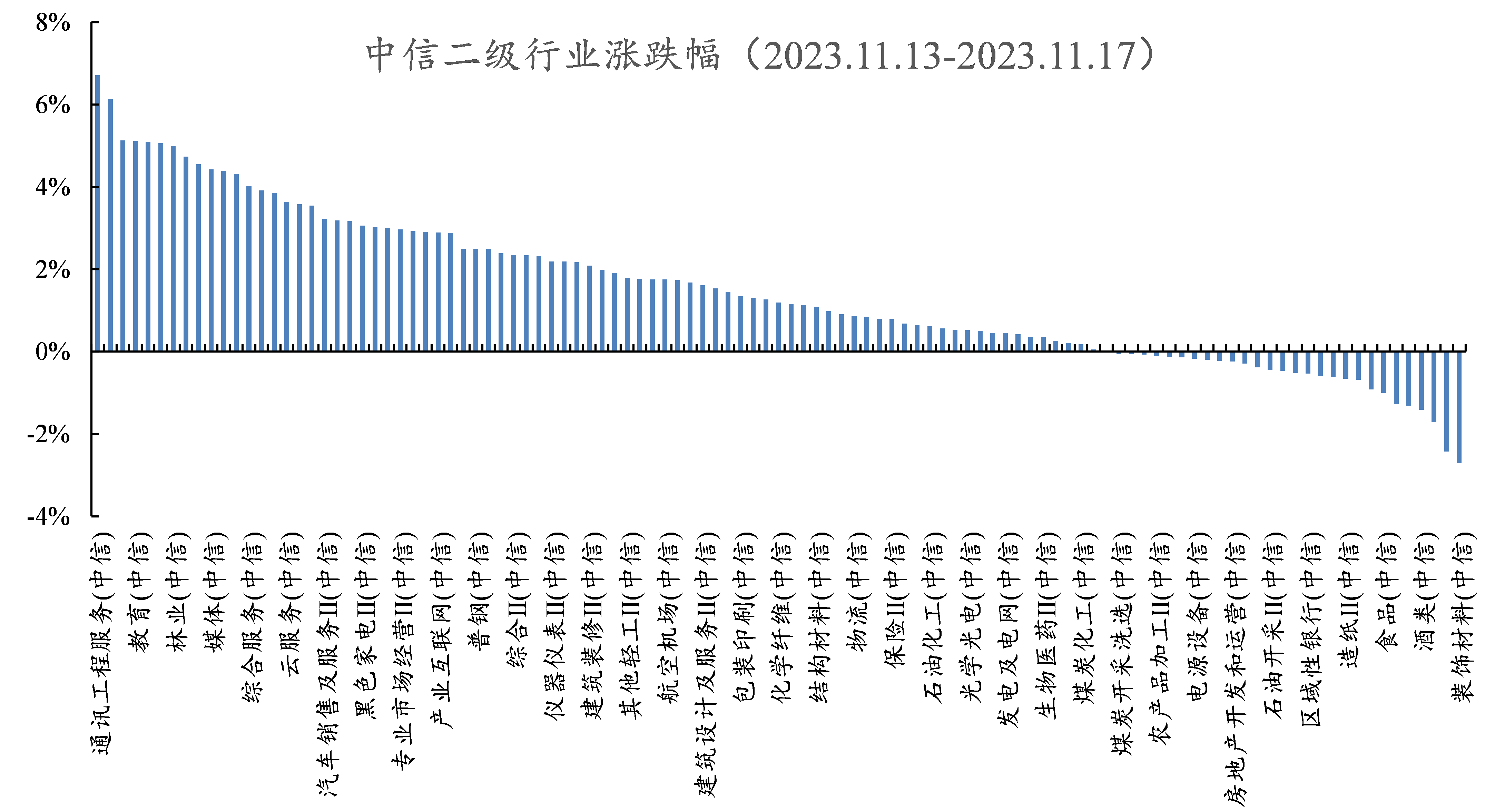 行业方面,根据中信二级行业分类,本周涨幅靠前的行业有通讯工程服务、汽车零部件、摩托车及其他、教育、增值服务,分别上涨6.71%、6.13%、5.13%、5.11%、5.10%;本周跌幅靠前的行业有装饰材料、新能源动力系统、白色家电、酒类、电信运营,分别下跌2.72%、2.43%、1.72%、1.42%、1.31%。