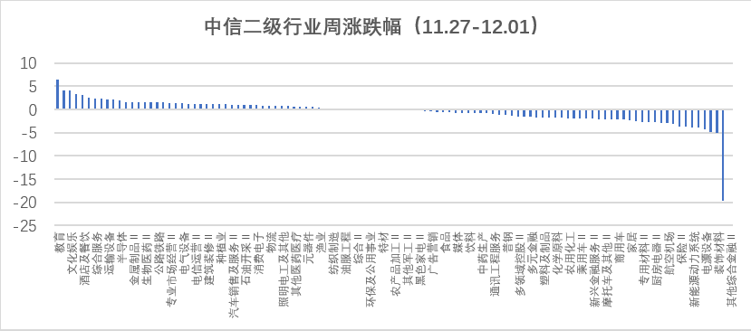 根据中信二级行业分类,涨幅靠前的行业有教育、电商及服务Ⅱ、文化娱乐、煤炭开采洗选、酒店及餐饮,分别上涨6.46%、4.06%、4.06%、3.29%、3.20%;跌幅靠前的行业有资产管理Ⅱ、装饰材料、房地产开发和运营、电源设备、房地产服务,分别下跌19.59%、5.01%、4.89%、4.35%、3.83%。