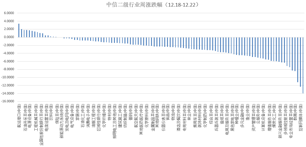 本周上证指数跌0.94%,创业板指数跌1.23%,沪深300指数跌0.13%,中证500指数跌2.53%。根据中信二级行业分类,本周涨幅靠前的行业为航运港口、煤炭开采洗选、石油开采、白色家电及电源设备,上涨幅度分别为3.35%、2.00%、1.84%、1.82%、1.75%;本周跌幅靠前的行业为媒体、互联网媒体、文化娱乐、教育及产业互联网,下跌幅度分别为13.92%、12.28%、11.21%、8.39%、8.28%。