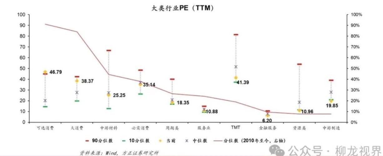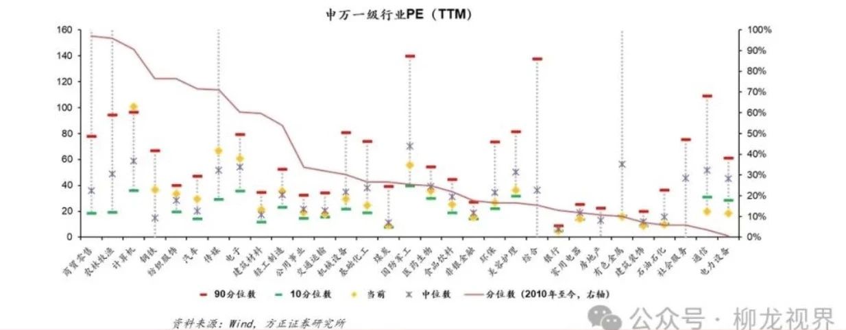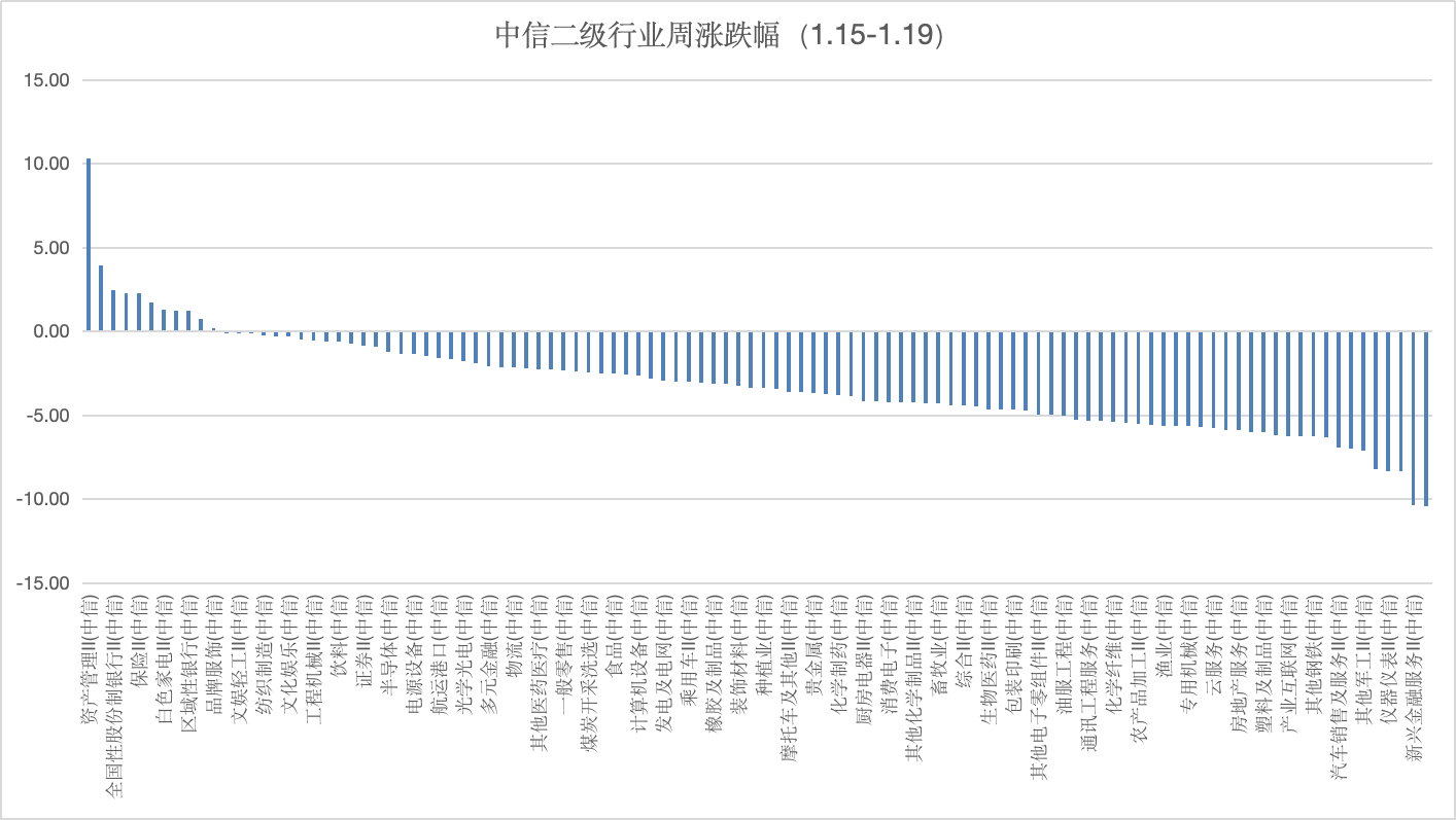行业方面,根据中信二级行业分类,本周涨幅靠前的板块是资产管理、旅游及休闲、全国性股份制银行、电信运营及保险板块,上涨幅度分别为10.32%、3.95%、2.44%、2.274%及2.271%;本周跌幅靠前的板块是兵器兵装、煤炭化工、仪器仪表、金属制品及特材板块,下跌幅度分别为-10.40%、-8.35%、-8.31%、-8.24%及-7.11%。