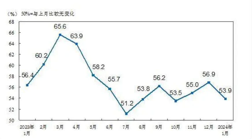 2. 非制造业商务活动指数为50.7%,比上月上升0.3个百分点,表明非制造业延续平稳扩张走势。建筑业商务活动指数为53.9%,比上月下降3.0个百分点;服务业商务活动指数为50.1%,上升0.8个百分点。新订单指数为47.6%,上升0.1个百分点,非制造业市场需求降幅持续收窄。投入品价格指数为49.6%,与上月持平,显示非制造业企业用于经营活动的投入品价格总体水平继续回落。销售价格指数为48.9%,下降0.4个百分点,非制造业销售价格总体水平有所下降。从业人员指数为47.0%,下降0.1个百分点,非制造业企业用工景气度略有回落。业务活动预期指数为59.7%,下降0.6个百分点,仍位于较高景气区间,表明非制造业企业对近期市场发展保持乐观。