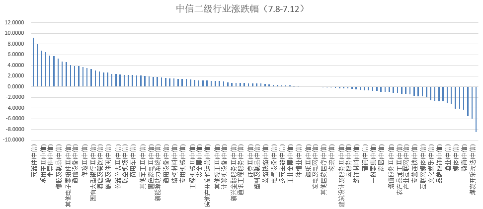 本周上证指数涨0.72%,创业板指数涨1.69%,沪深300指数涨1.20%,中证500指数涨1.09%。根据中信二级行业分类,本周涨幅靠前的板块是汽车零部件、橡胶制品、全国性股份制银行、其他电子零组件及化学纤维,上涨幅度分别为5.74%、5.31%、4.77%、4.63%、4.07%;本周跌幅靠前的板块是资产管理、煤炭开采洗选、航运港口、教育、兵器兵装,下跌幅度分别为8.45%、5.94%、5.45%、4.31%、4.11%。