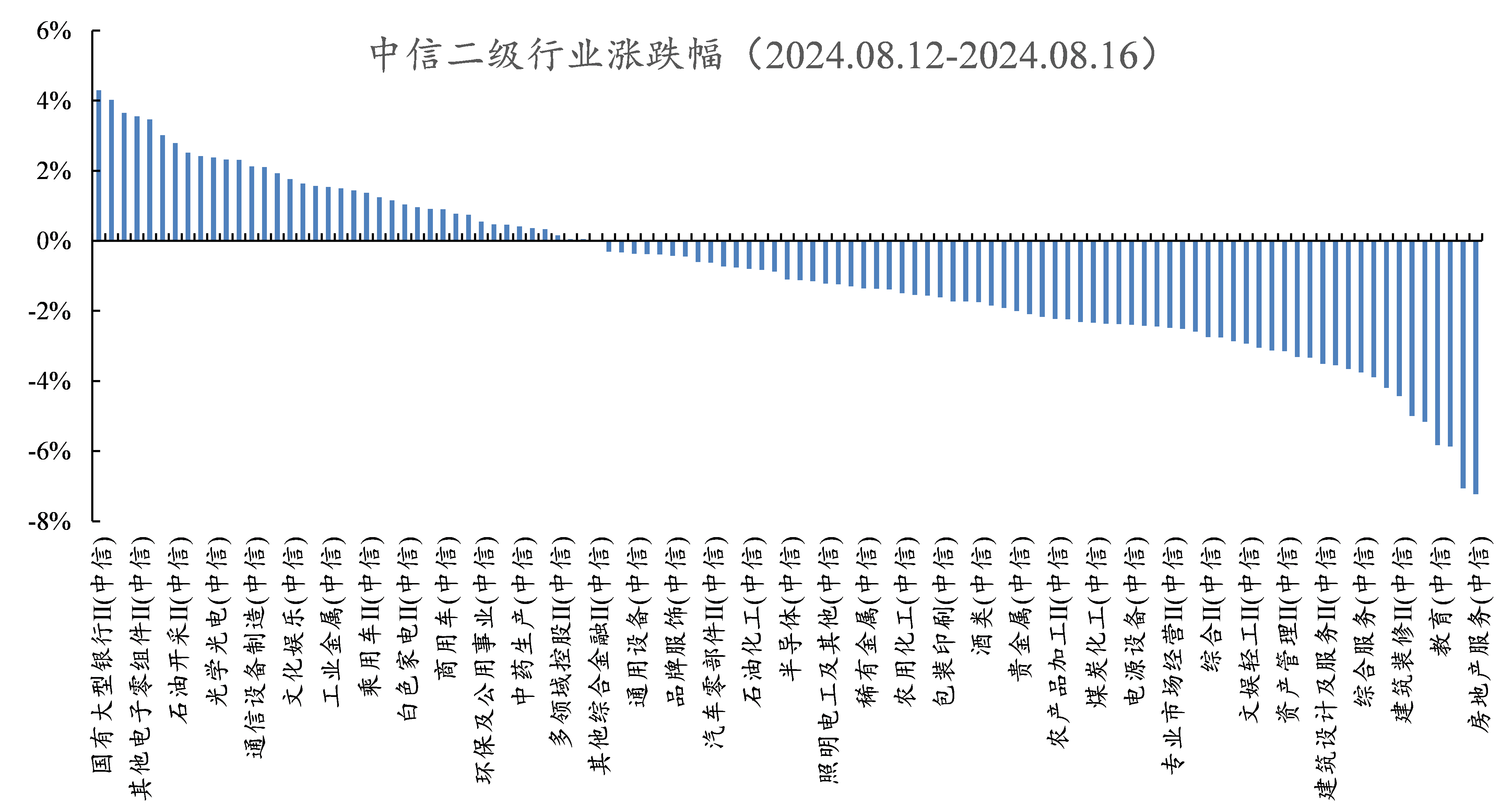 行业方面,根据中信二级行业分类,本周涨幅靠前的行业有国有大型银行、增值服务、媒体、其他电子零组件、电信运营,分别上涨4.30%、4.02%、3.65%、3.56%、3.47%;本周跌幅靠前的行业有房地产服务、摩托车及其他、装饰材料、教育、一般零售,分别下跌7.23%、7.07%、5.87%、5.83%、5.17%。