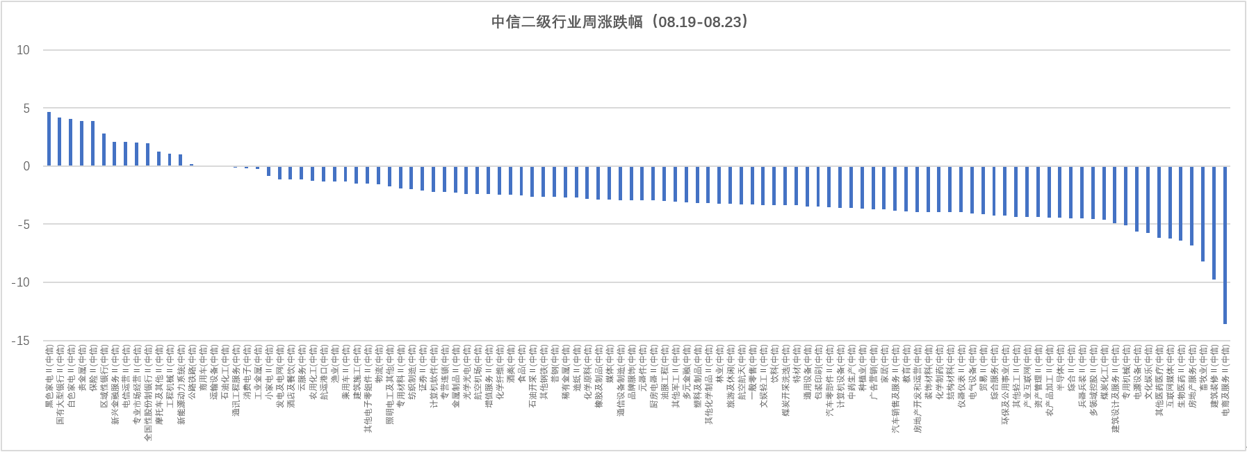 根据中信二级行业分类,涨幅靠前的行业有黑色家电Ⅱ、国有大型银行Ⅱ、白色家电Ⅱ、贵金属、保险Ⅱ,分别上涨4.67%、4.21%、4.09%、3.89%、3.87%;跌幅靠前的行业有电商及服务Ⅱ、建筑装修Ⅱ、畜牧业、房地产服务、生物医药Ⅱ,分别下跌13.58%、9.76%、8.19%、6.83%、6.39%。