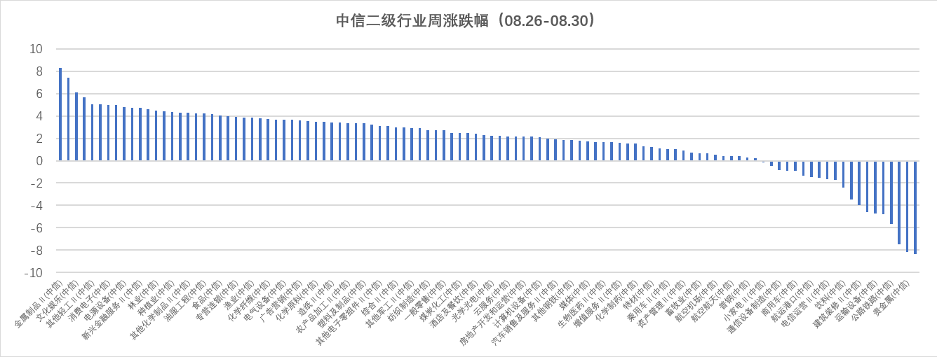 根据中信二级行业分类,涨幅靠前的行业有金属制品Ⅱ、摩托车及其他Ⅱ、文化娱乐、橡胶及制品、其他轻工Ⅱ,分别上涨8.27%、7.42%、6.11%、5.70%、5.06%;跌幅靠前的行业有国有大型银行Ⅱ、贵金属、电商及服务Ⅱ、公路铁路、区域性银行,分别下跌8.36%、8.14%、7.49%、5.69%、4.80%。