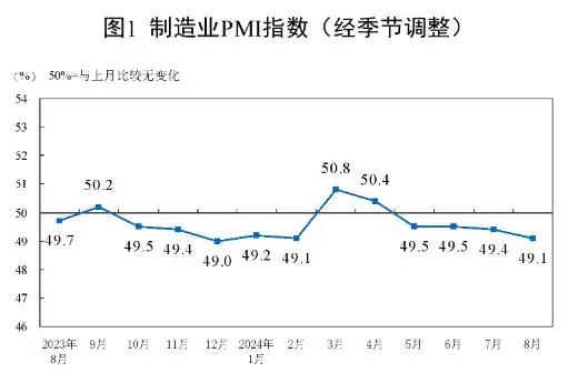 8月份,制造业采购经理指数(PMI)为49.1%,比上月下降0.3个百分点,制造业景气度小幅回落。从企业规模看,大型企业PMI为50.4%,比上月下降0.1个百分点,仍高于临界点;中、小型企业PMI分别为48.7%和46.4%,比上月下降0.7和0.3个百分点。从分类指数看,在构成制造业PMI的5个分类指数中,生产指数、新订单指数、原材料库存指数、从业人员指数和供应商配送时间指数均低于临界点。生产指数为49.8%,比上月下降0.3个百分点,低于临界点,表明制造业企业生产活动有所放缓。新订单指数为48.9%,比上月下降0.4个百分点,表明制造业市场需求有所回落。原材料库存指数为47.6%,比上月下降0.2个百分点,表明制造业主要原材料库存量较上月减少。从业人员指数为48.1%,比上月下降0.2个百分点,表明制造业企业用工景气度有所下降。供应商配送时间指数为49.6%,比上月上升0.3个百分点,仍低于临界点,表明制造业原材料供应商交货时间继续延长。