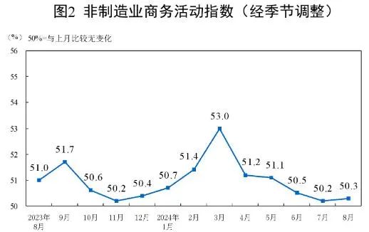 8月份,非制造业商务活动指数为50.3%,比上月上升0.1个百分点,非制造业景气水平略有回升。分行业看,建筑业商务活动指数为50.6%,比上月下降0.6个百分点;服务业商务活动指数为50.2%,比上月上升0.2个百分点。从行业看,铁路运输、航空运输、邮政、电信广播电视及卫星传输服务、文化体育娱乐等行业商务活动指数均位于55.0%以上较高景气区间;资本市场服务、房地产、居民服务等行业商务活动指数低于临界点。