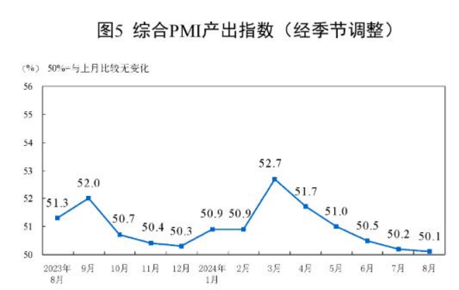 8月份,综合PMI产出指数为50.1%,比上月下降0.1个百分点,继续位于扩张区间,表明我国企业生产经营活动总体保持小幅扩张。
