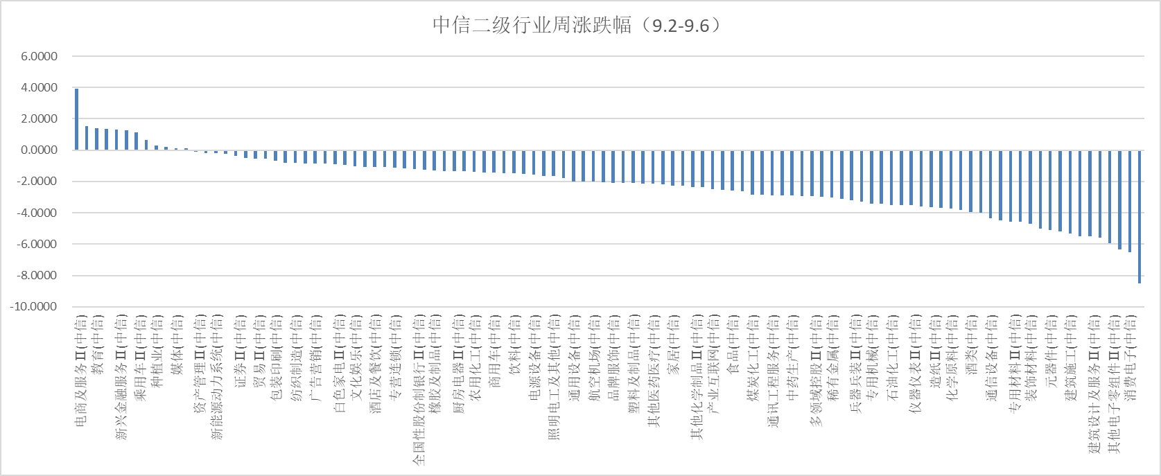 本周上证指数跌2.69%,创业板指数跌2.68%,沪深300指数跌2.71%,中证500指数跌2.19%。根据中信二级行业分类,本周涨幅靠前的行业是电商服务、汽车零部件、公路铁路、专业市场经营及乘用车,上涨幅度分别为3.94%、1.52%、1.40%、1.34%、1.32%;本周跌幅靠前的行业是石油开采、消费电子、工业金属、其他电子零组件及半导体,下跌幅度分别为8.52%、6.52%、6.35%、5.95%、5.58%。