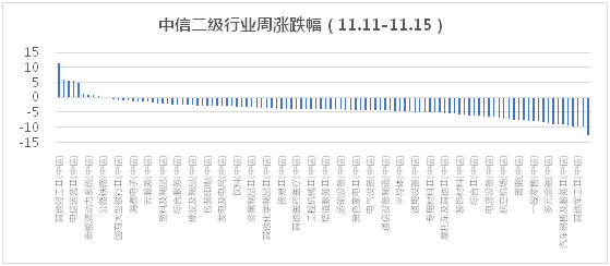 根据中信二级行业分类,涨幅靠前的行业有其他轻工Ⅱ、教育、互联网媒体、电信运营Ⅱ、广告营销,分别上涨11.25%、5.99%、5.44%、5.41%、4.96%;跌幅靠前的行业有渔业、兵器兵装Ⅱ、其他军工Ⅱ、多领域控股Ⅱ、房地产开发和运营,分别下跌12.70%、9.71%、9.70%、9.66%、9.31%。