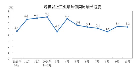 10月份,规模以上工业增加值同比实际增长5.3%(增加值增速均为扣除价格因素的实际增长率)。从环比看,10月份,规模以上工业增加值比上月增长0.41%。1—10月份,规模以上工业增加值同比增长5.8%。