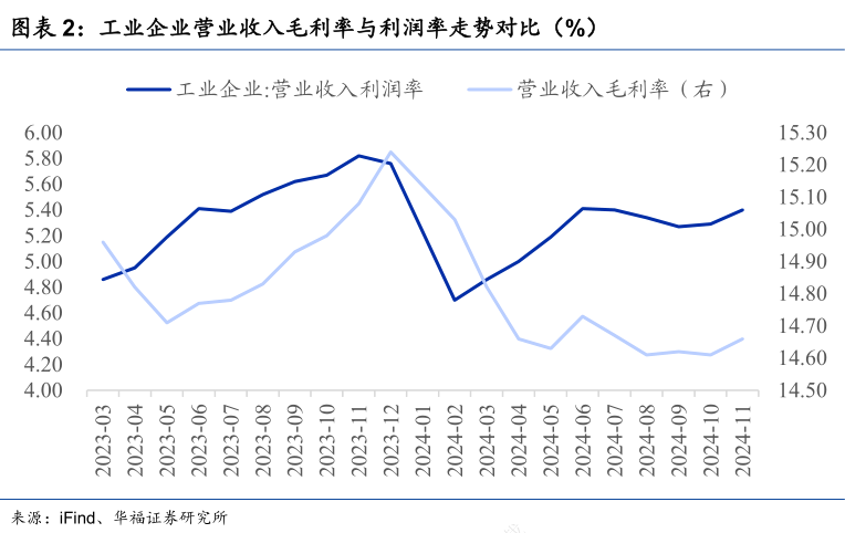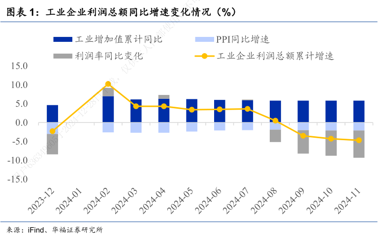 点评:11 月单月工业企业利润增速降幅进一步收窄,企业效益延续改善。11 月企业利润三因素格局较上月变化不大,但单月量、价、利润率均环比改善,而利润率的进一步修复较为明显。具体而言,“价”依旧保持低位徘徊,但 PPI 环比降幅继续收窄;“量”依旧不差,生产端韧性仍强;“利润率”在上月明显触底反弹后进一步修复,带动单月工企利润降幅继续收窄。工业企业库存周期延续回踩,但企业微观杠杆率出现触底回升信号,负债增速自去年12月以来首次超过资产和所有者权益增速,尊龙凯时 人生就是搏!平台认为背后是企业盈利尤其是利润率的连续修复带动,以及本轮稳增长政策尤其是金融政策的进一步显效支撑企业加杠杆信心。向前看,企业微观杠杆率出现初步修复,企业端宽信用若能够进一步加力提效,企业加杠杆意愿有望继续修复,叠加价格端的逐步企稳,企业预期的进一步改善有望带动企业补库意愿回升。