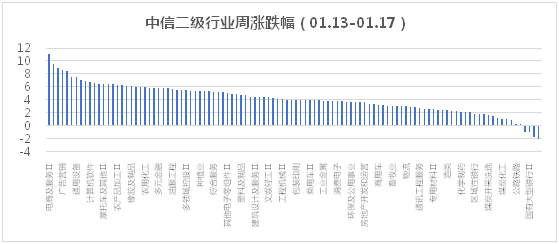 根据中信二级行业分类,涨幅靠前的行业有电商及服务Ⅱ、产业互联网、新兴金融服务Ⅱ、广告营销、增值服务Ⅱ,分别上涨11.13%、9.48%、8.93%、8.58%、8.47%;跌幅靠前的行业有白色家电Ⅱ、饮料、国有大型银行Ⅱ、资产管理Ⅱ,分别下跌2.01%、1.72%、1.01%、0.89%。