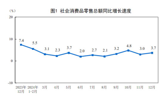 12月份,社会消费品零售总额45172亿元,同比增长3.7%。其中,除汽车以外的消费品零售额39509亿元,增长4.2%。2024年,社会消费品零售总额487895亿元,比上年增长3.5%。其中,除汽车以外的消费品零售额437581亿元,增长3.8%。