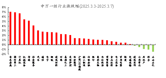 行业方面,根据申万一级行业分类,本周涨幅靠前的行业有有色金属、国防军工、计算机、机械设备、传媒,分别上涨7.08%、6.96%、6.74%、5.46%、5.16%;本周跌幅靠前的行业有石油石化、综合、房地产、公用事业、建筑装饰,分别下跌1.49%、1.03%、0.91%、0.50%、0.22%。